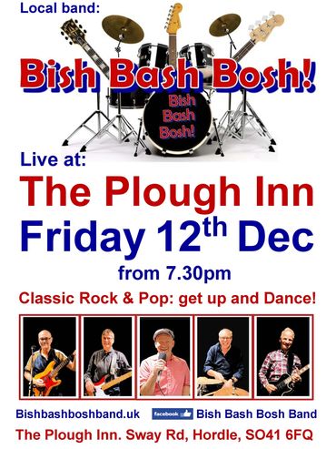 Bish Bash Bosh! pub gigs over the festive season 2024 in Lymington, Sway, Everton and Barton-on-Sea.