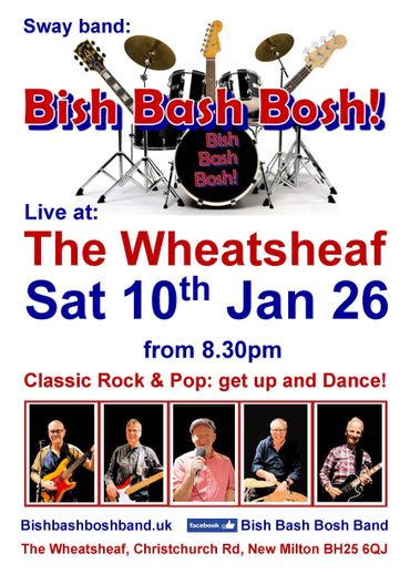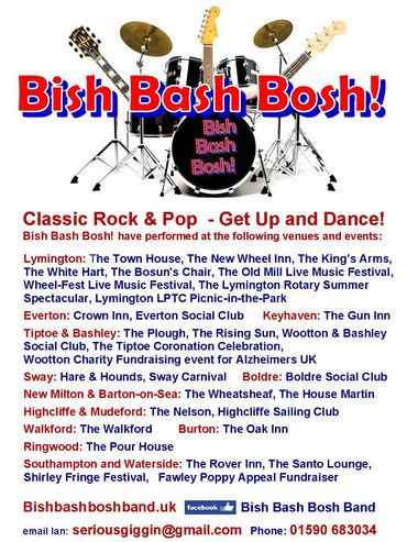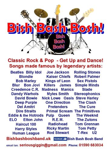 Bish Bash Bosh! formed early in 2023 and quickly worked up a repertoire of well-known upbeat pop and rock songs. Lively performances at festivals, pubs, charity fundraising events and social clubs have resulted in a growing fan-base. Now with a repertoire of more than 80 songs; the band can compile a setlist for any event, function or wedding that will have everyone up and dancing. Based in The New Forest, near Lymington, the band will be appearing at local events, pubs and festivals – see Upcoming Gigs below.